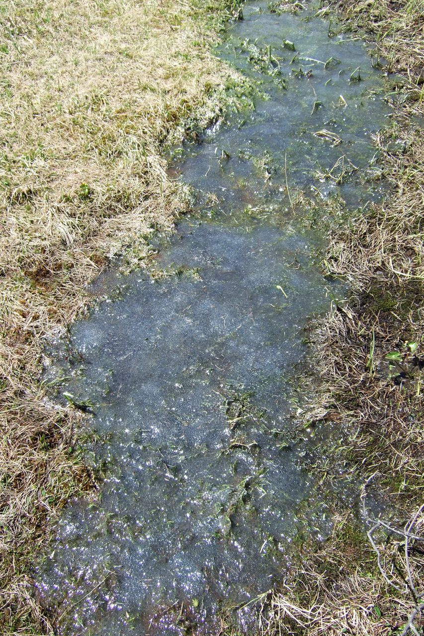 Der Grasfrosch laicht im flchen Uferbereich so dass der Laich manchmal trockenfällt wenn der Wasserspiegel des Gewässers sinkt.