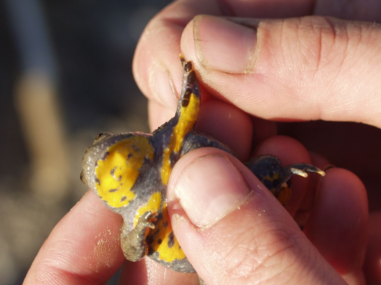 Die Männchen der Gelbauchunke besitzen während der Paarungszeit Brunftschwielen an den Armen.