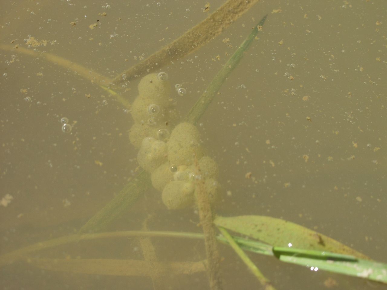 Der kleine Laichballen der Gelbbauchunke mit Schlamm bedeckt.