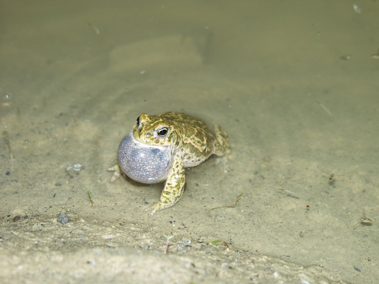Die Männchen der Kreuzkröte besitzen eine grosse kehlständige Schallblase, die das Quaken stark verstärkt.