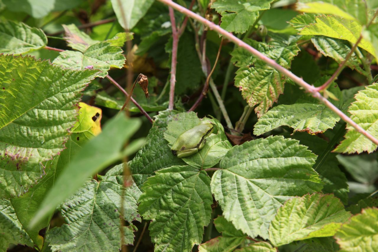 Juveniler Laubfrosch auf Brombeerblatt