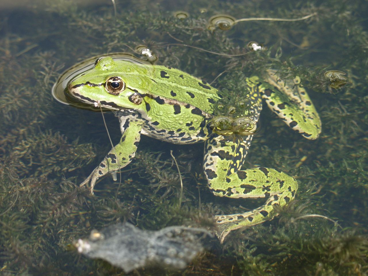 Wasserfrosch und dessen abgestossene Haut im Vordergrund