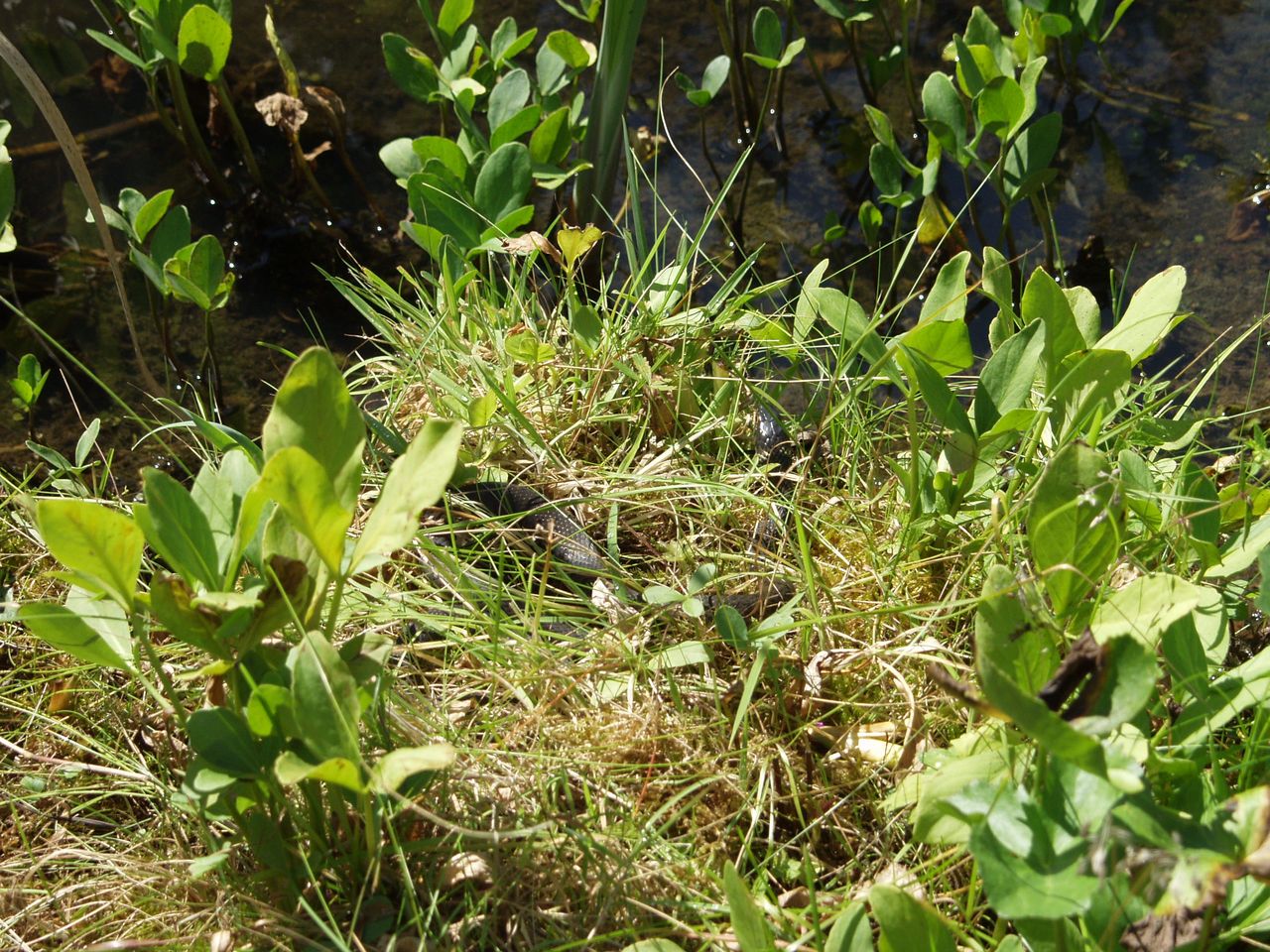 Eine Ringelnatter nimmt sich ein Sonnenbad am Ufer eines Weihers.